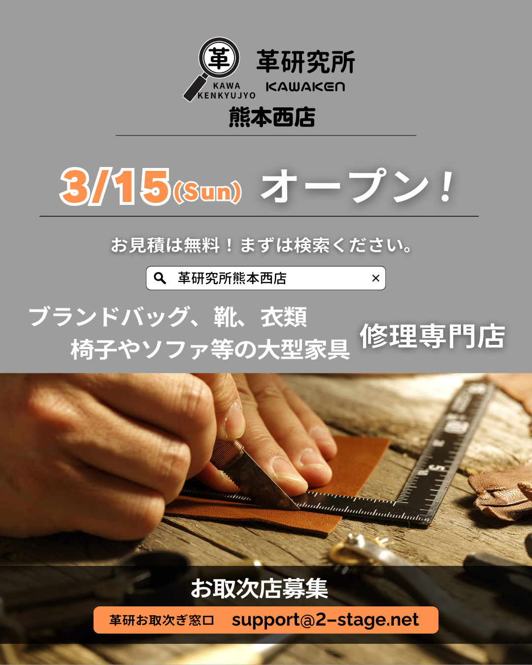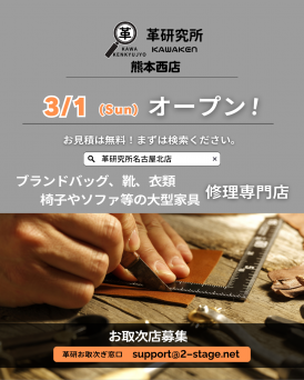 熊本県内に新しい革研究所がオープン致します。 詳細は、こちらで告知させていただきます。お楽しみに☆